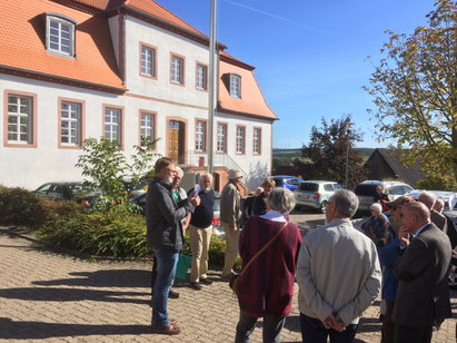 Im Rahmen der Kurzexkursion nach Rimhorn gibt Thomas Heß Tagungsteilnehmern vor dem Pretlackschen Hofhaus eine kurze Einführung in die Geschichte des Ortes.