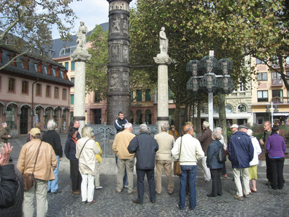 Teilnehmer der Ganztagesfahrt nach Mainz vor der restau-rierten Nagelsäule, die 1916 als Spendendenkmal für Kriegsopfer errichtet worden war