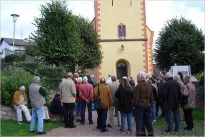 Die Teilnehmer an der Kurzexkursion: Geschichte und Bau der Vielbrunner ev. Kirche mit dem aus dem 1495 stammen-den Westturm wurden im Detail erläutert und besichtigt.