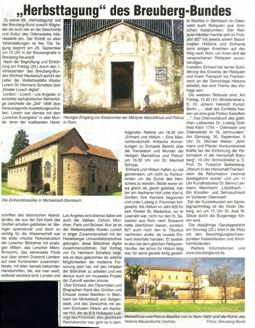 Nicht zuletzt anlässlich des Jubiläumsjahres „1200 Jahre Mark Michelstadt“ stand die Persönlichkeit Einhards, eine der herausragendsten Persönlichkeiten am Hofe Karls des Großen, im Mittelpunkt des Eröffnungsreferates „Einhard – Mark Michelstadt und Seligenstadt“, das von dem Leiter der Welterbestätte Kloster Lorsch, Dr. Hermann Schefers, gehalten wurde. Der Referent würdigte vor allem die Bedeutung der Schenkung der Mark Michelstadt für die Entwicklung des Klosters Lorsch und die Überführung der zunächst für das Kloster Steinbach in Rom geholten Reliquien der Heiligen Petrus und Marcellinus von Michelstadt-Steinbach nach Seligenstadt.